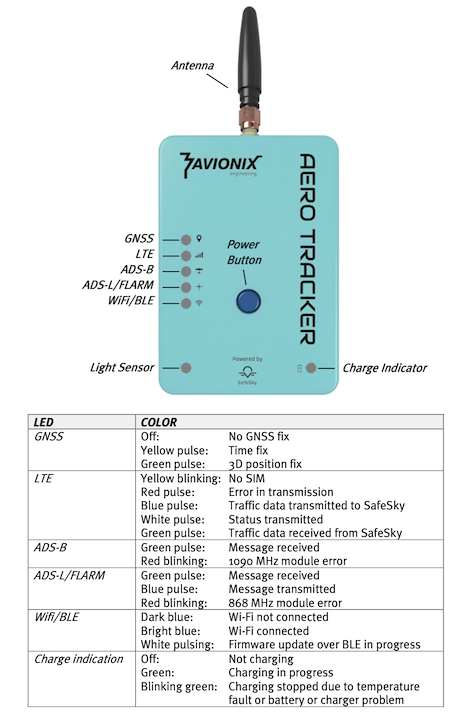 The Aero Tracker uses a vertical strip of LED lights to communicate its current status.
